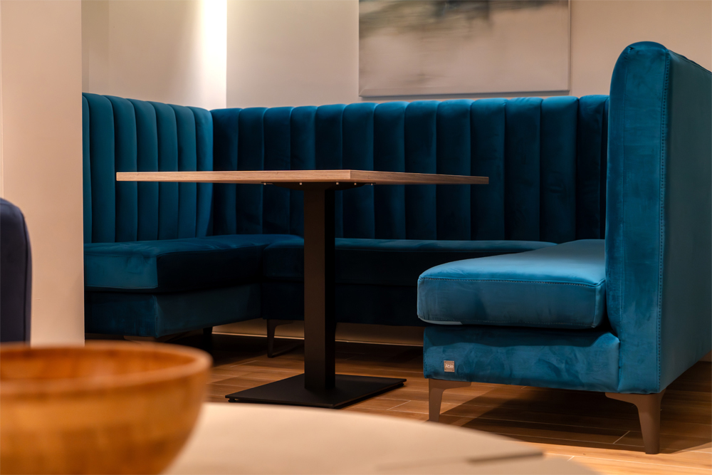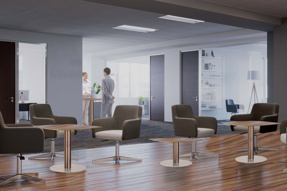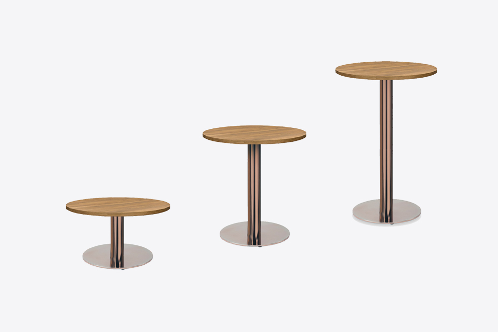 Break out tables with brushed stainless steel base & column available in 4 heights, 3 top shapes & 13 finishes.