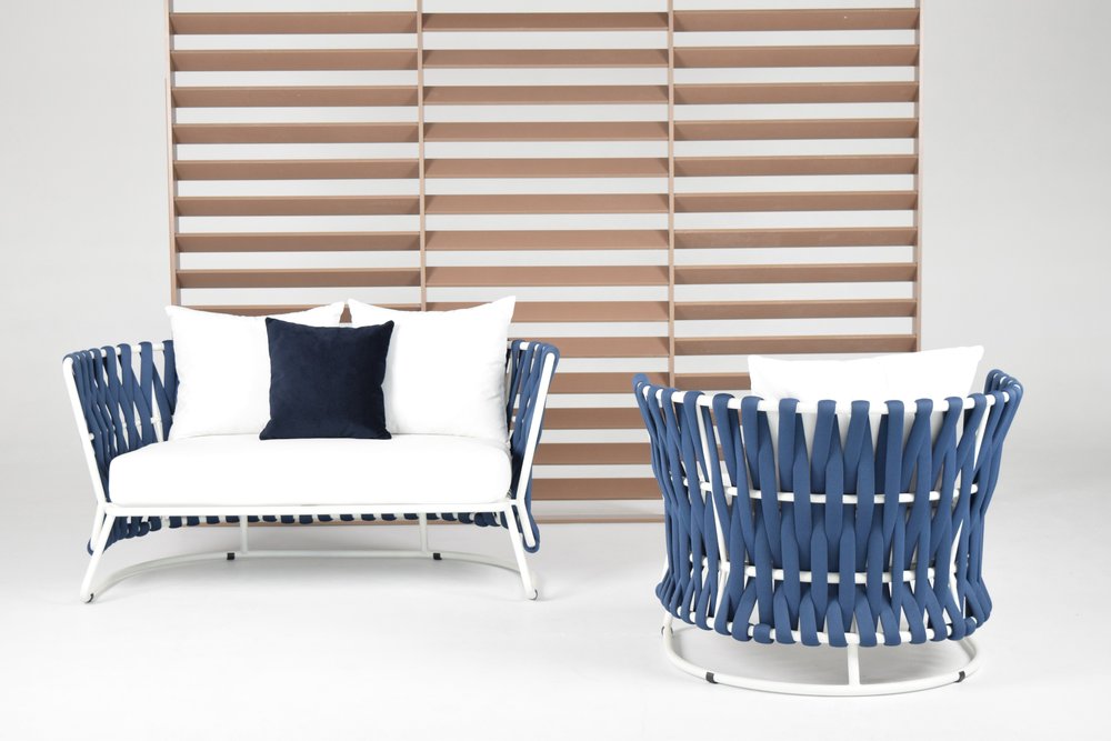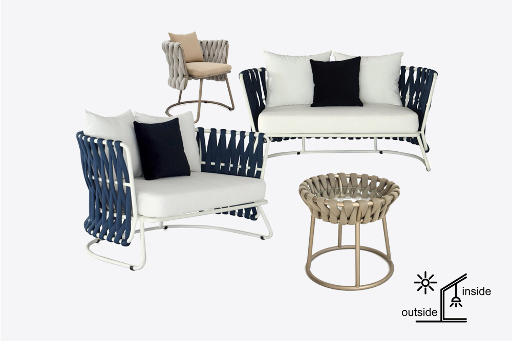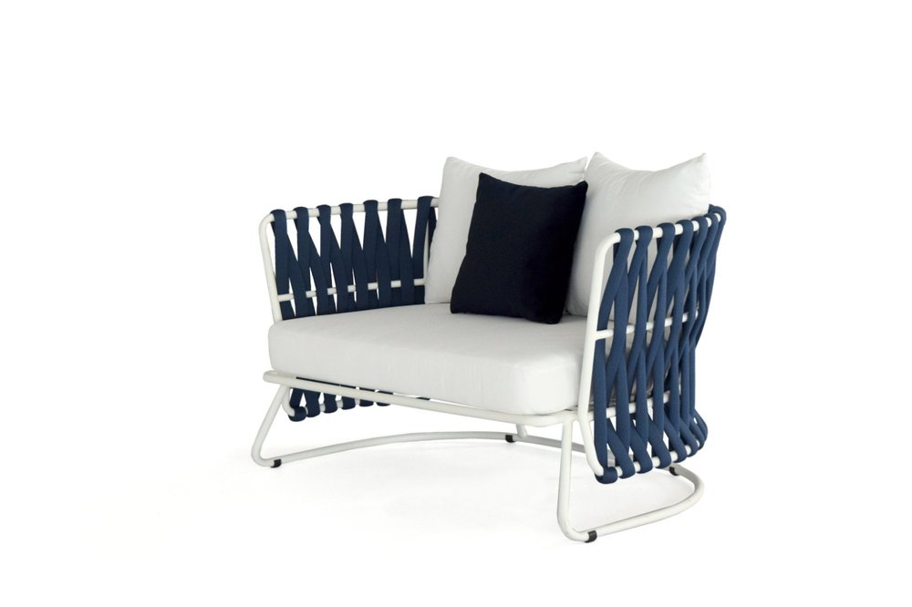 Chelsea is characterized by the continuous line of the aluminium frame that gently curves to form a stable base. The sides are from intertwined tube with a flexible core and woven outer in a range of colours.