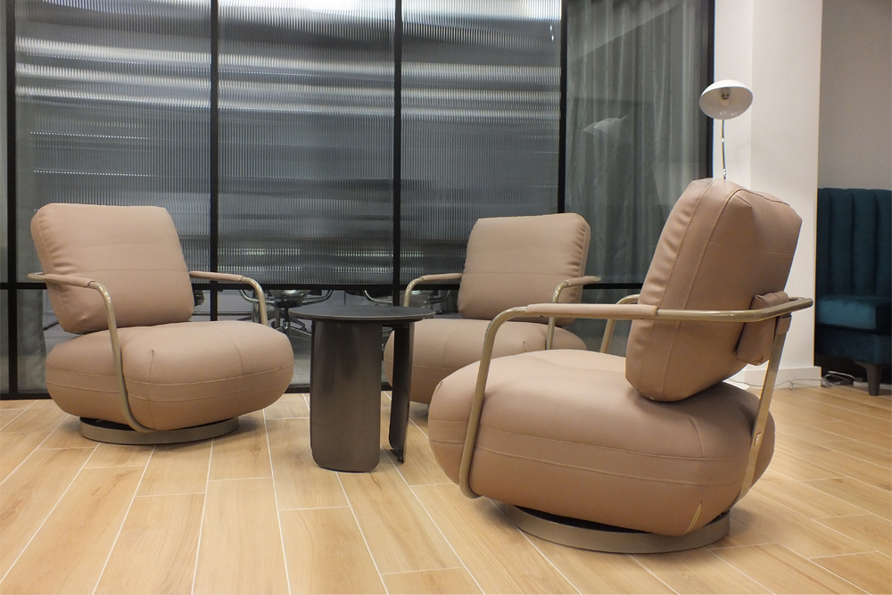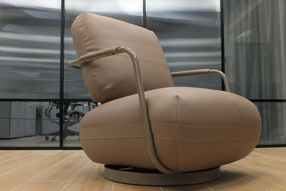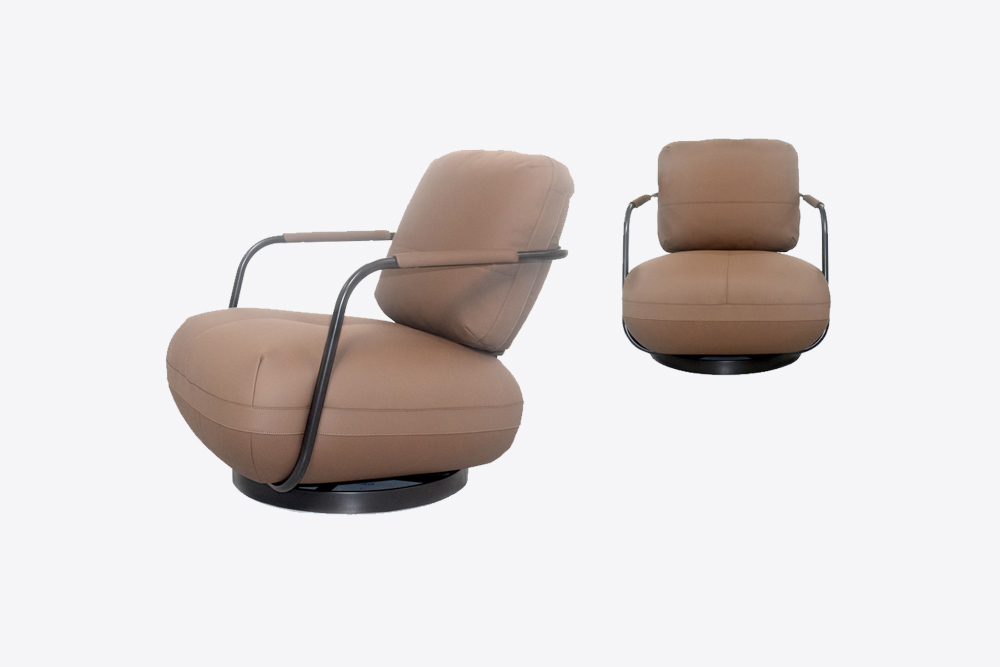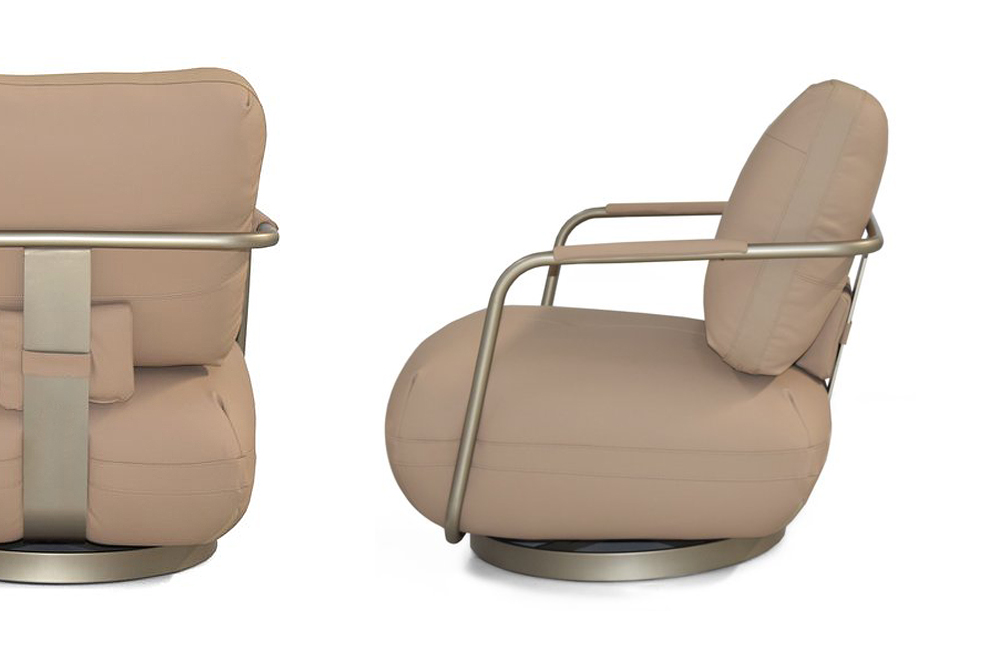 The Contour armchair embodies the industrial aesthetic with the soft, rounded fabric or leather upholstery. The metal frame is available in various metallic finishes and provides a modern twist on vintage lines, creating a unique silhouette and a luxurious seating experience.