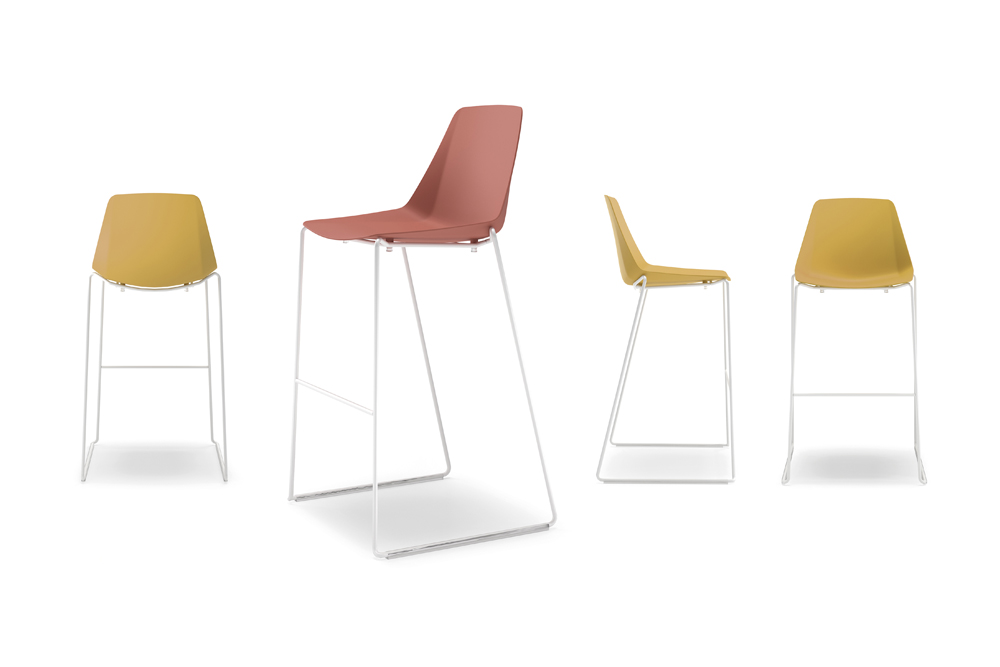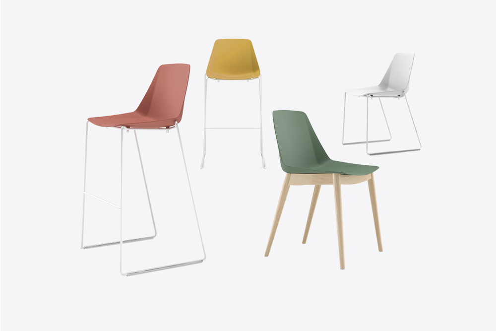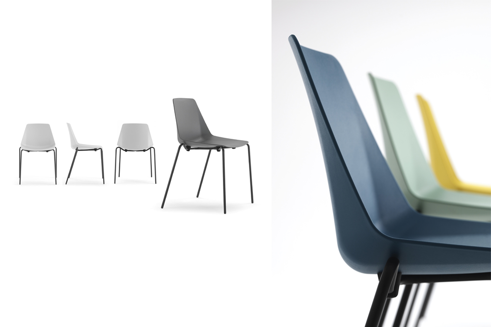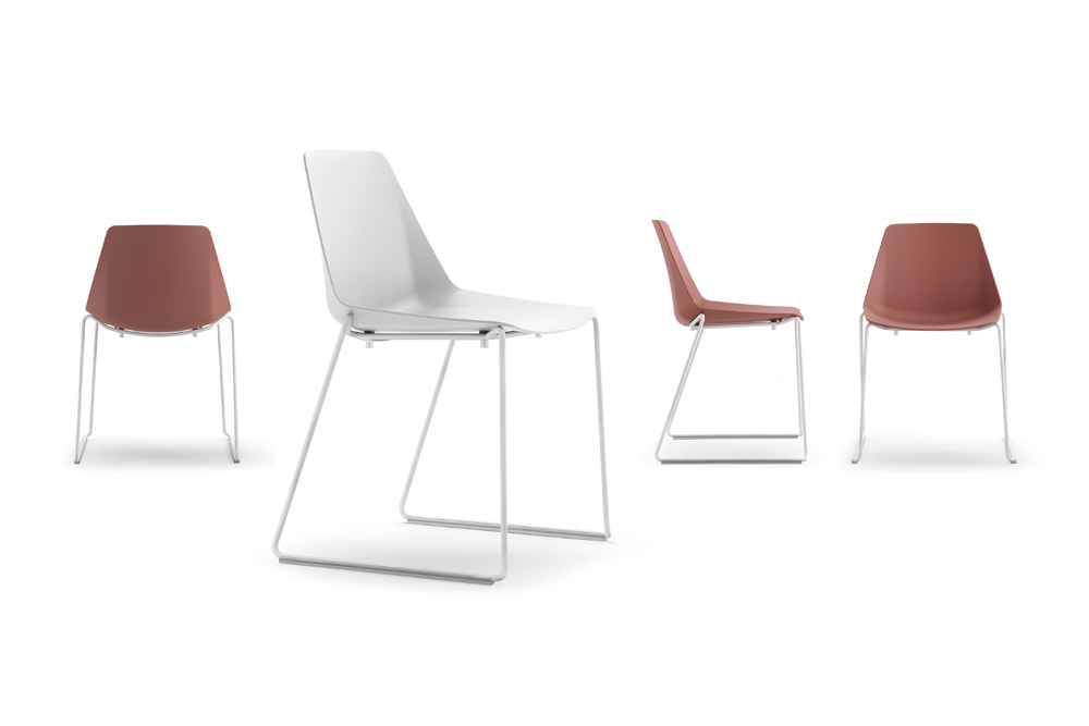 Skopa has an angular moulded one-piece seat and back available in a range of colours – white, grey, sage, blue, brick red and mustard. The seat shell is supported on a four-leg natural beech under-frame or a skid base finished with chrome, black or white powder coat.