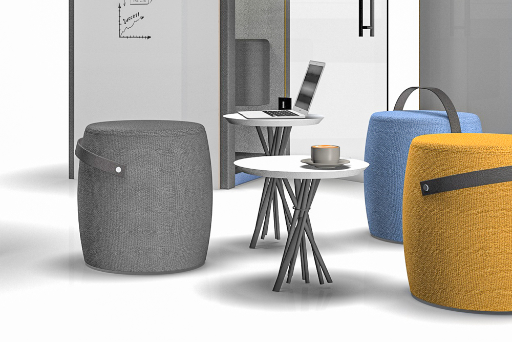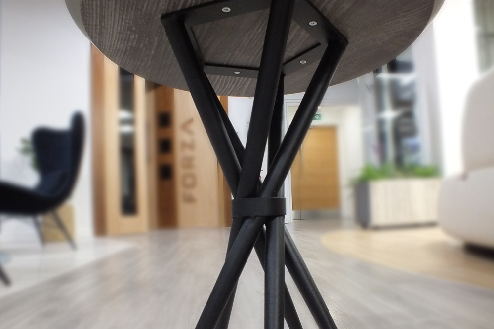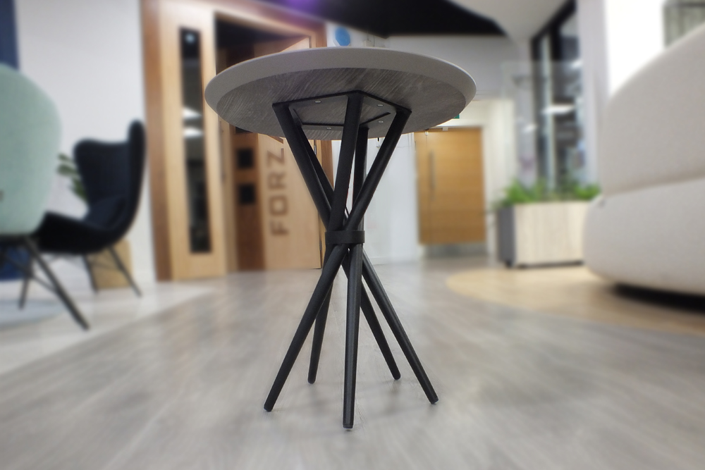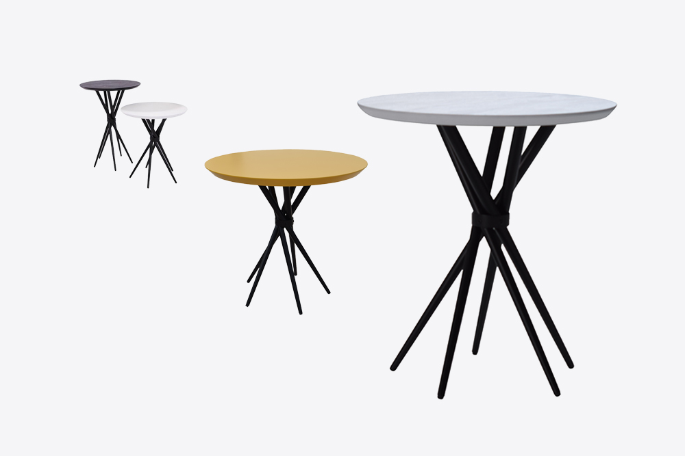 A ‘wigwam’ base side table in two heights, the light-weight Triss table is easily moved around. The crossed stick base supports 450mm diameter tops in lacquered MDF finishes.